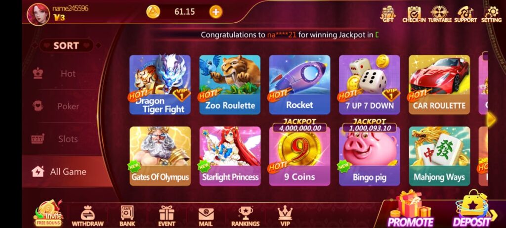 Fortune GEMS, Rocket Jackpot, 9 Coins, Bingo Pig, Moon of RA, Dragon Tiger Fight, Lucky Dollar, Roulette, Teen Patti, Red and Black, Andar Bahar, Matka, Baccarat, Lucky TeenPatti, Mines, 777 Thunder Fire, Fruit Classic, Gates of Olympus, and Golden Frog, etc.